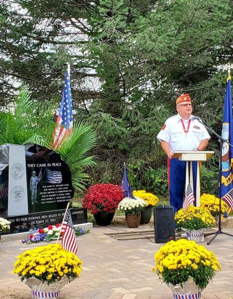 Six years ago Tim Edquist, nephew of Thomas Thorstad, started a new job. His mom Janice invited him to the Beirut Memorial in Jacksonville.  He declined the invitation since he just started a new job. On October 23 he went to work and was riding with his boss who asked if he knew that it was the anniversary of the Beirut Bombing. He replied that yes, his mom had asked him to go to North Carolina for the memorial.  His supervisor was surprised and asked why he would be going. Tim explained that his uncle was killed there.  His boss, who was even more shocked at this point, replied that his brother, Edward A. Johnston was killed there. What a small world! Charlie then invited him to the memorial in Struthers, Ohio. The following year Janice and Tim attended the Struthers, Ohio memorial. While there, the Johnston family encouraged her to build a memorial and start a service in Indiana.  Janice did years of research to identify everyone who was killed from Indiana. She identified a beautiful Veterans Park that has a replica wall with the names of over 1600 men from Indiana who were killed in Vietnam. She spoke to the Veterans Park and they were happy to have a Beirut Memorial Stone there. The community really came together to make this memorial happen.  With input from the family, Janice’s nephew designed a beautiful memorial stone. The dedication took place on September 21 and had over 160 people in attendance, including several Beirut Veterans. They plan on having an annual memorial event there.