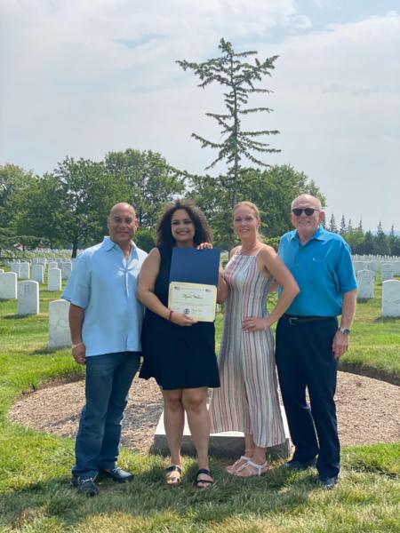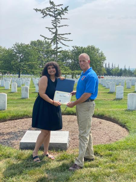 This meeting to present the scholarship award was held at Arlington Cemetery among the graves of those who have fought and died for our country. The significance of this location was that it was at the headstone of Kaelah's great-grandmother, Sally Ann Johnson. Sally and her husband Army CWO James Johnson served in Beirut together and were both injured in the April 18, 1983 American Embassy Bombing there. Sally worked for the Defense Intelligence Agency.